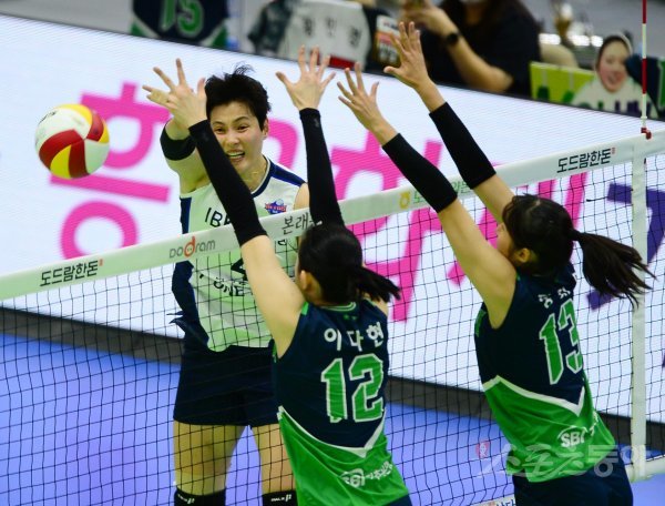 4일 수원실내체육관에서 열린 ‘2022-2023 도드람 V-리그’ 여자부 수원 현대건설과 화성 IBK기업은행의 경기에서 IBK기업은행 최희진이 현대건설 블로커를 피해 스파이크하고 있다.