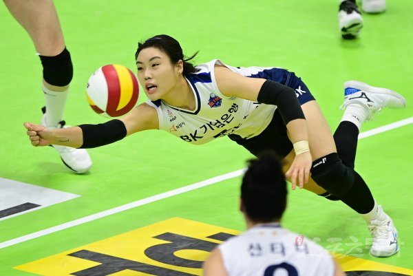 4일 수원실내체육관에서 열린 ‘2022-2023 도드람 V-리그’ 여자부 수원 현대건설과 화성 IBK기업은행의 경기에서 IBK기업은행 김하경이 몸을 날려 볼을 살리고 있다.