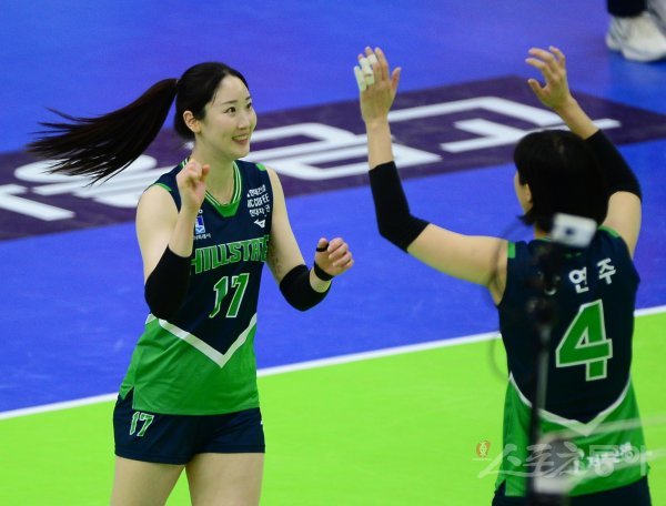 4일 수원실내체육관에서 열린 ‘2022-2023 도드람 V-리그’ 여자부 수원 현대건설과 화성 IBK기업은행의 경기에서 득점에 성공한 현대건설 고예림이 기뻐하고 있다.