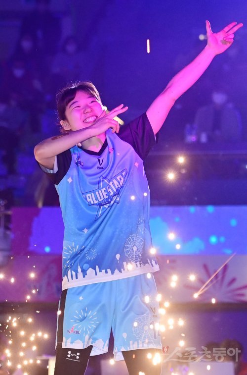 8일 인천 도원실내체육관에서 열린 ‘신한은행 SOL 2022-2023 여자프로농구’ 올스타전 핑크스타와 블루스타의 경기에 앞서 블루스타 허예은이 입장 퍼포먼스를 펼치고 있다. 인천 | 주현희 기자 teth1147@donga.com