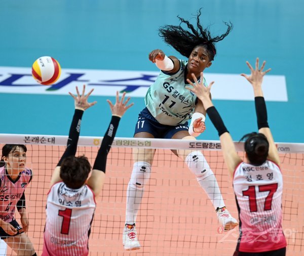 9일 서울 장충체육관에서 열린 ‘2022~2023 도드람 V-리그’ 여자부 GS칼텍스와 KGC인삼공사 경기에서 GS칼텍스 모마가 KGC임삼공사의 블로킹 사이로 스파이크를 날리고 있다.