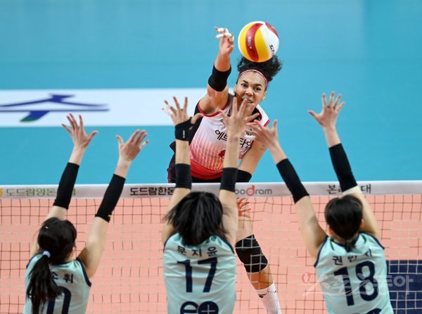 9일 서울 장충체육관에서 열린 ‘2022~2023 도드람 V-리그’ 여자부 GS칼텍스와 KGC인삼공사 경기에서 KGC인삼공사 엘리자벳이 GS칼텍스의 블로킹 사이로 스파이크를 날리고 있다. 장충 | 김종원 기자 won@donga.com