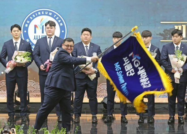 MG새마을금고 씨름단이 10일 창단식을 갖고 공식 출범했다. 박차훈 새마을금고중앙회장이 창단식에서 ‘씨름단기’를 힘차게 흔들며 씨름발전의 마중물이 되겠다고 선언했다. 사진제공 새마을금고