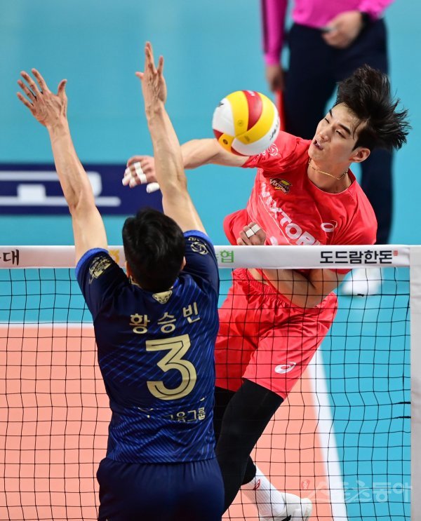 10일 서울 장충체육관에서 열린 ‘2022-2023 도드람 V-리그’ 남자부 서울 우리카드와 수원 한국전력의 경기에서 한국전력 임성진이 우리카드 블로커 앞에서 스파이크를 하고 있다.