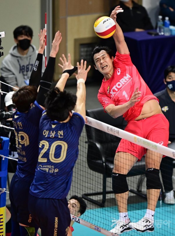 10일 서울 장충체육관에서 열린 ‘2022-2023 도드람 V-리그’ 남자부 서울 우리카드와 수원 한국전력의 경기에서 한국전력 서재덕이 우리카드 블로커 앞에서 스파이크를 하고 있다.