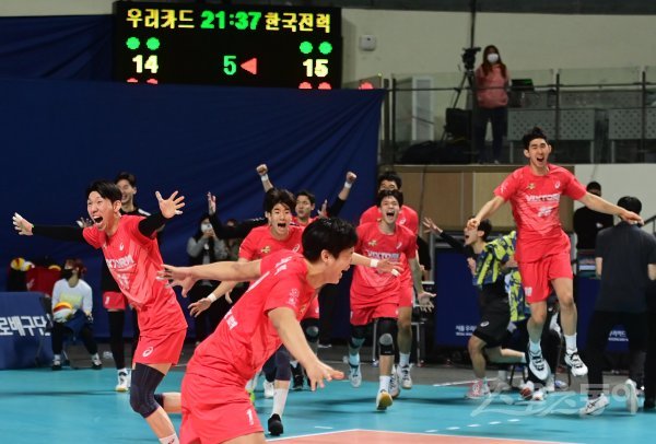 10일 서울 장충체육관에서 열린 ‘2022-2023 도드람 V-리그’ 남자부 서울 우리카드와 수원 한국전력의 경기에서 세트스코어 3-2로 승리한 한국전력 선수들이 환호하고 있다.