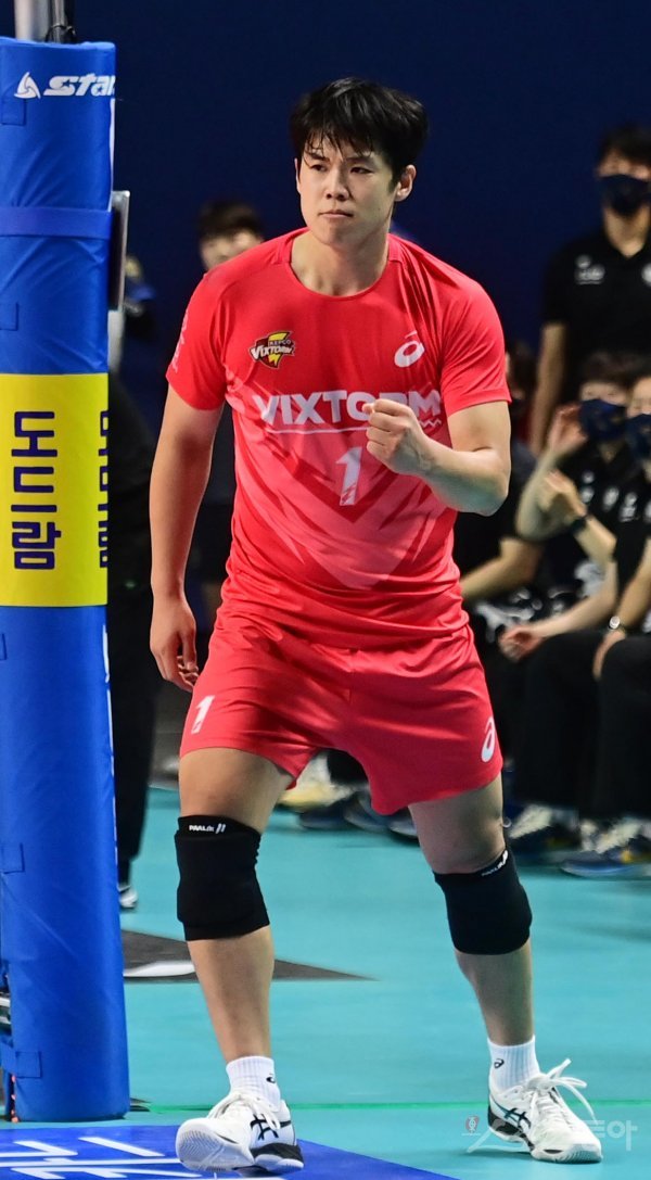 10일 서울 장충체육관에서 열린 ‘2022-2023 도드람 V-리그’ 남자부 서울 우리카드와 수원 한국전력의 경기에서 득점에 성공한 서재덕이 기뻐하고 있다. 장충 | 주현희 기자 teth1147@donga.com