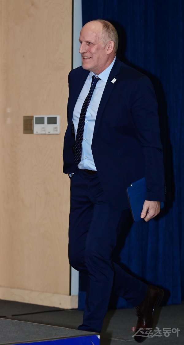 마이클 뮐러 신임 국가대표 전력강화위원장이 11일 서울 종로구 축구회관에서 열린 취임 기자회견에 들어서고 있다.