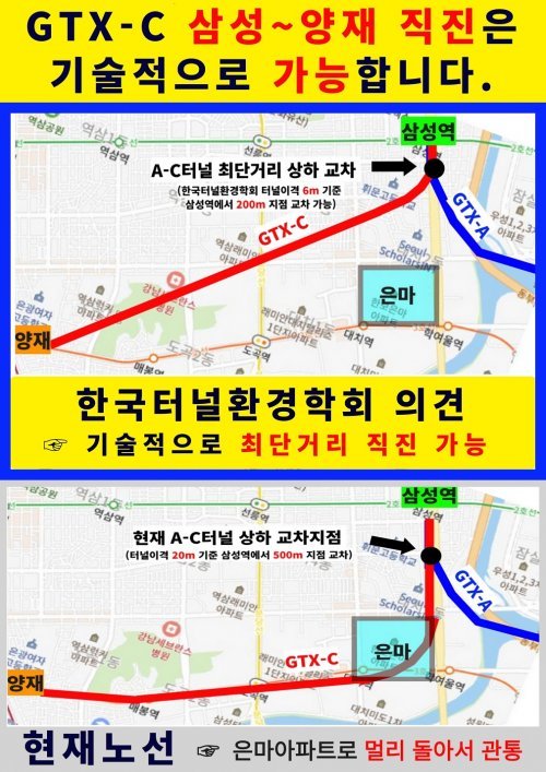 이에 은마아파트 측은 “현 노선이 이미 삼성역에서 500m 직진 후 GTX-A 노선과 상하로 교차 통과하고 있고 기존 터널과의 상하 이격 거리가 20m 이상 확보돼 있어, 양재역 방향 직진 노선 시공에는 전혀 문제가 없다”며 “A-C터널간 이격거리를 좁혀 더 빨리 상하 교차하는 것도 가능한지를 한국터널환경학회에 질의했다”고 밝혔다.