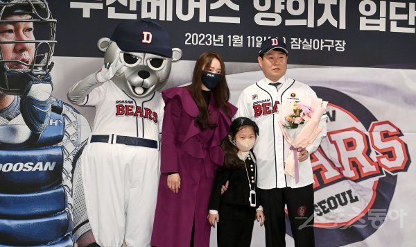 두산 베어스로 복귀한 포수 양의지가 11일 서울 잠실야구장에서 열린 입단식에서 두산 유니폼을 입고 가족과 기념촬영을 하고 있다.