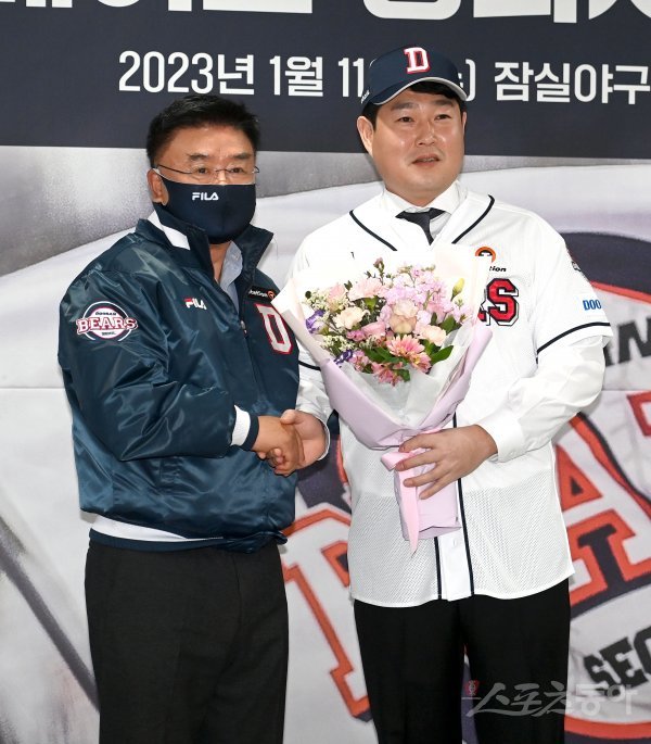 두산 베어스로 복귀한 포수 양의지가 11일 서울 잠실야구장에서 열린 입단식에서 두산 유니폼을 입고 김태룡 단장과 기념촬영을 하고 있다.