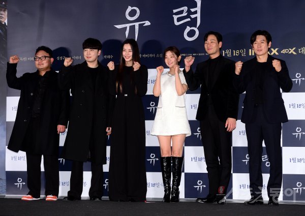 이해영 감독, 배우 서현우, 이하늬, 박소담, 박해수, 설경구가 11일 서울 용산구 CGV용산아이파크몰에서 열린 영화 ‘유령’ 언론시사회에서 카메라를 향해 포즈를 취하고 있다.
