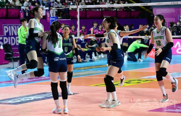11일 인천 삼산월드체육관에서 ‘2022-2023 도드람 V리그’ 인천 흥국생명과 수원 현대건설의 여자부 경기가 열렸다. 현대건설이 흥국생명을 상대로 세트스코어 3-2로 승리한 후 선수들이 코트에서 기쁨을 나누고 있다.