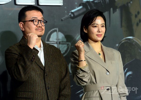 연상호 감독, 배우 김현주가 12일 건대 롯데시네마에서 열린 넷플릭스 오리지널 ‘정이’ 제작보고회에서 포즈를 취하고 있다.