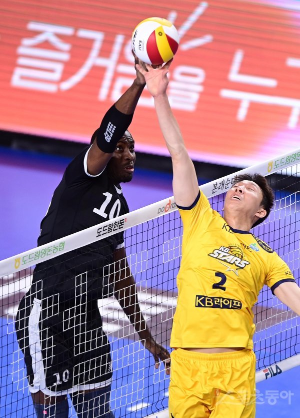 12일 천안 유관순체육관에서 열린 ‘2022-2023 도드람 V-리그’ 남자부 천안 현대캐피탈과 의정부 KB손해보험의 경기에서 현대캐피탈 오레올이 KB손해보험의 리시브 실수에 밀어넣기 공격을 하고 있다.