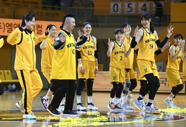 15일 청주체육관에서 열린 ‘신한은행 SOL 2022~2023 여자프로농구’ KB스타즈와 하나원큐 경기에서 KB스타즈가 85-76 승리를 거뒀다. 승리 공약으로 프로야구 유희관 해설위원이 선수들과 춤을 추고 있다.