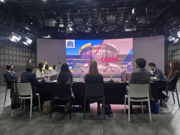 서울관광재단 관계자가 서울 답사을 온 국제본부 관계자를 대상으로 메인 행사장인 코엑스를 소개하고 있다.