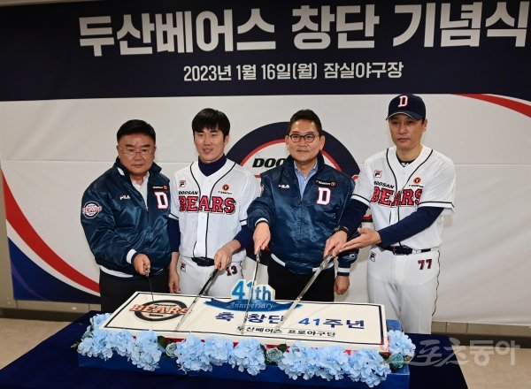16일 서울 잠실야구장에서 열린 ‘두산 베어스 41주년 창단 기념식’에서 두산 김태룡 단장, 허경민, 전풍 대표이사 이승엽 감독이 떡 케이크 커팅식을 하고 있다. 주현희 기자 teth1147@donga.com