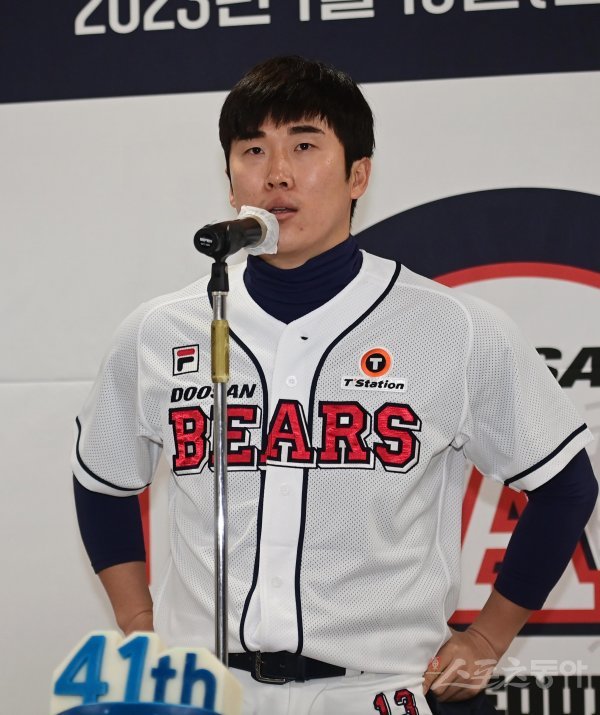 16일 서울 잠실야구장에서 열린 ‘두산 베어스 41주년 창단 기념식’에서 두산 허경민이 주장을 맡아 인사하고 있다.
