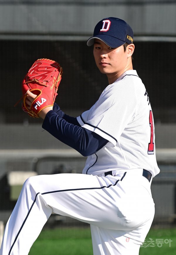 16일 서울 잠실야구장에서 열린 ‘두산 베어스 41주년 창단 기념식’을 마친 후 두산 조선명이 프로필 촬영을 하고 있다.