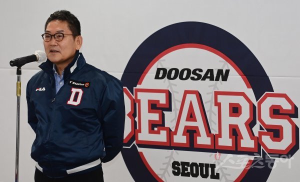 16일 서울 잠실야구장에서 열린 ‘두산 베어스 41주년 창단 기념식’에서 두산 전풍 대표이사가 인사말을 하고 있다.