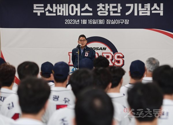 16일 서울 잠실야구장에서 열린 ‘두산 베어스 41주년 창단 기념식’에서 두산 전풍 대표이사가 인사말을 하고 있다.