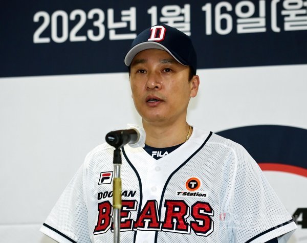 16일 서울 잠실야구장에서 열린 ‘두산 베어스 41주년 창단 기념식’에서 두산 이승엽 감독이 인사말을 하고 있다.
