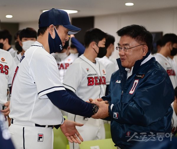 16일 서울 잠실야구장에서 열린 ‘두산 베어스 41주년 창단 기념식’에서 두산 김태룡 단장과 이승엽 감독이 인사하고 있다.
