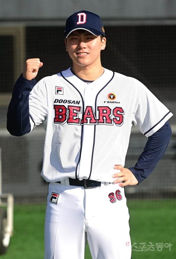 16일 서울 잠실야구장에서 열린 ‘두산 베어스 41주년 창단 기념식’을 마친 후 두산 윤준호가 프로필 촬영을 하고 있다.