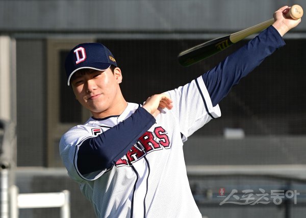 16일 서울 잠실야구장에서 열린 ‘두산 베어스 41주년 창단 기념식’을 마친 후 두산 윤준호가 프로필 촬영을 하고 있다.