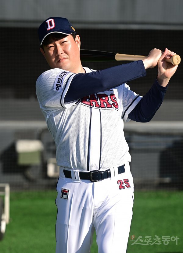 16일 서울 잠실야구장에서 열린 ‘두산 베어스 41주년 창단 기념식’을 마친 후 두산 양의지가 프로필 촬영을 하고 있다.