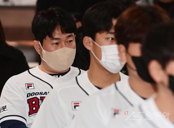 16일 서울 잠실야구장에서 열린 ‘두산 베어스 41주년 창단 기념식’에서 두산 양의지가 대표이사의 인사말을 듣고 있다.