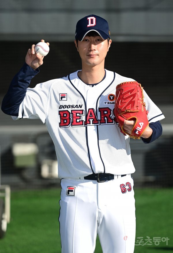 16일 서울 잠실야구장에서 열린 ‘두산 베어스 41주년 창단 기념식’을 마친 후 두산 고봉재가 프로필 촬영을 하고 있다.
