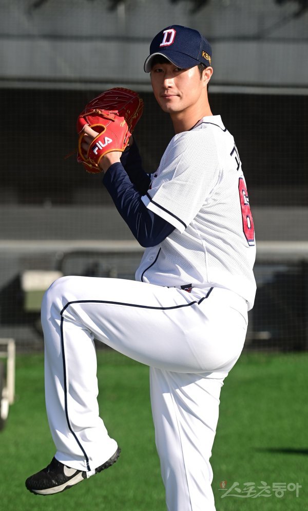 16일 서울 잠실야구장에서 열린 ‘두산 베어스 41주년 창단 기념식’을 마친 후 두산 고봉재가 프로필 촬영을 하고 있다.
