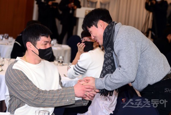 2023 WBC 야구국가대표팀이 16일 서울 리베라호텔에서 모여 오리엔테이션을 가졌다. WBC 대표팀 오지환과 김하성이 인사를 나누고 있다.