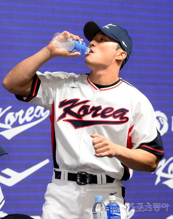 2023 WBC 야구국가대표팀이 16일 서울 리베라호텔에서 기자회견을 가졌다. WBC 대표팀 김하성이 기자회견 후 음료를 마시고 있다.