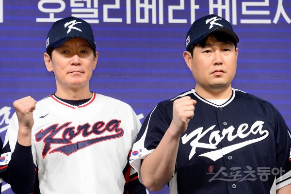 2023 WBC 야구국가대표팀이 16일 서울 리베라호텔에서 기자회견을 가졌다. WBC 대표팀 이강철 감독, 양의지가 포즈를 취하고 있다.