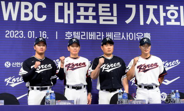 2023 WBC 야구국가대표팀이 16일 서울 리베라호텔에서 기자회견을 가졌다. WBC 대표팀 고우석, 이강철 감독, 양의지, 김하성이 포즈를 취하고 있다.