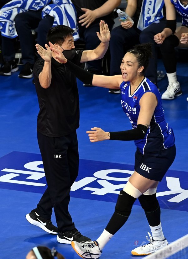 17일 경기도 화성실내체육관에서 ‘2022-2023 도드람 V리그’ 화성 IBK기업은행과 김천 한국도로공사의 여자부 경기가 열렸다. IBK기업은행 산타나가 득점을 올린 후 김호철 감독과 기쁨을 나누고 있다.