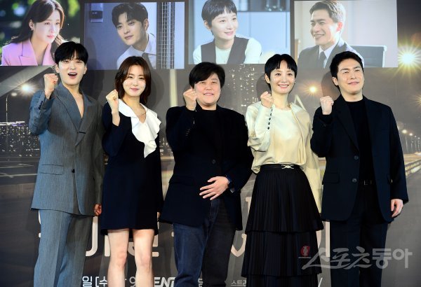 18일 서울 마포구 상암동 스탠포드호텔에서 열린 지니TV 오리지널 ‘남이 될 수 있을까’ 제작발표회에 참석한 장승조, 강소라, 김양희 감독, 조은지, 이재원이 포즈를 취하고 있다.