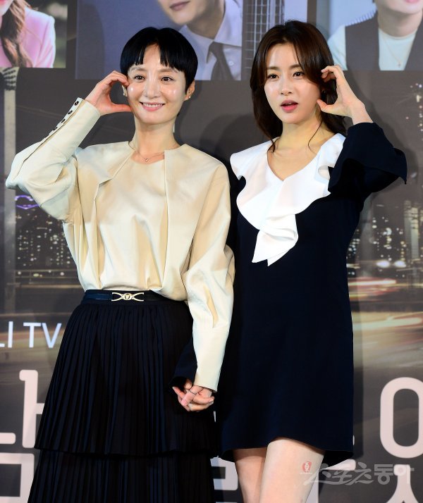 18일 서울 마포구 상암동 스탠포드호텔에서 열린 지니TV 오리지널 ‘남이 될 수 있을까’ 제작발표회에 참석한 조은지, 강소라가 포즈를 취하고 있다.