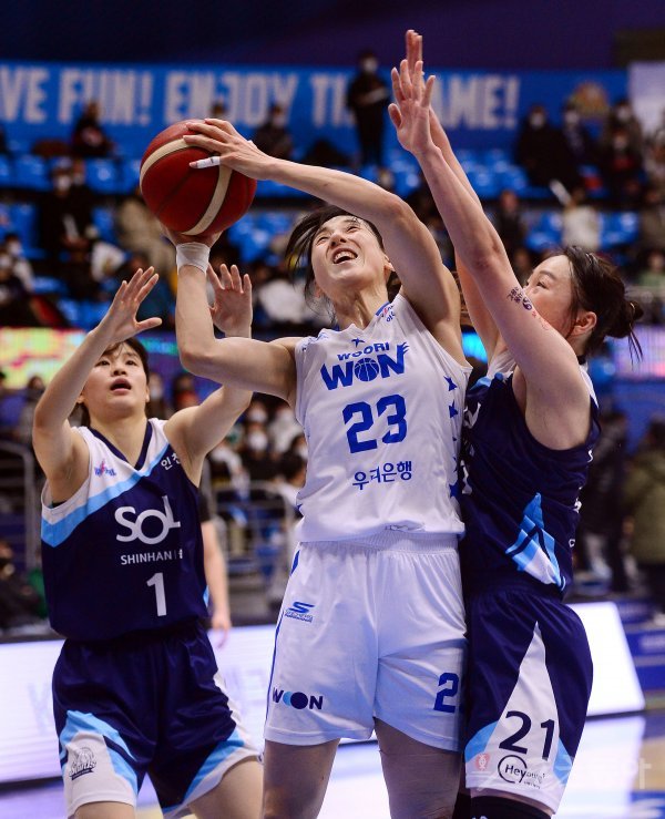 18일 인천 도원체육관에서 열린 ‘신한은행 SOL 2022-2022 여자프로농구’ 인천 신한은행과 아산 우리은행의 경기에서 우리은행 김단비가 신한은행 수비를 피해 슛을 쏘고 있다.