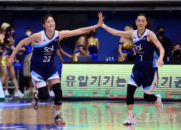 18일 인천 도원체육관에서 열린 ‘신한은행 SOL 2022-2022 여자프로농구’ 인천 신한은행과 아산 우리은행의 경기에서 신한은행 구슬이 득점을 올린 후 한채진과 기쁨을 나누고 있다.