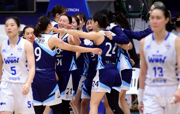 18일 인천 도원체육관에서 열린 ‘신한은행 SOL 2022-2022 여자프로농구’ 인천 신한은행과 아산 우리은행의 경기에서 신한은행이 우리은행을 상대로 81-78로 승리한 후 선수들이 코트에서 기쁨을 나누고 있다.