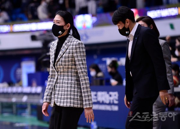 18일 인천 도원체육관에서 열린 ‘신한은행 SOL 2022-2022 여자프로농구’ 인천 신한은행과 아산 우리은행의 경기에서 신한은행에 패한 우리은행 전주원 코치, 위성우 감독이 경기장을 빠져나가고 있다.