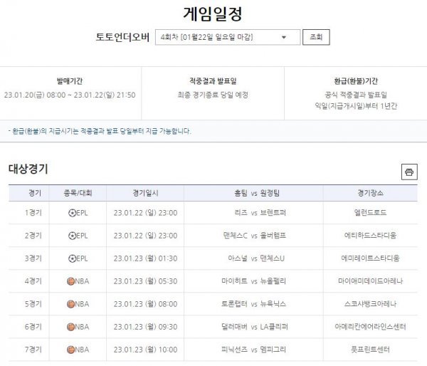 자세한 일정을 살펴보면 EPL에선 리즈-브렌트포드(1경기), 맨체스터시티-울버햄프턴(2경기), 아스널-맨체스터 유나이티드(3경기)전이 대상경기로 지정됐고, NBA에선 마이애미-뉴올리언스(4경기), 토론토-뉴욕(5경기), 댈러스-LA 클리퍼스(6경기), 피닉스-멤피스(7경기)전이 토토팬들을 찾아간다.