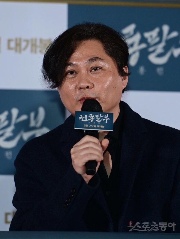 음악감독 최철호가 19일 서울 광진구 자양동 롯데시네마 건대입구점에서 열린 영화 ‘천룡팔부: 교봉전’ 언론시사회 및 내한 기자간담회에서 인사말을 하고 있다.