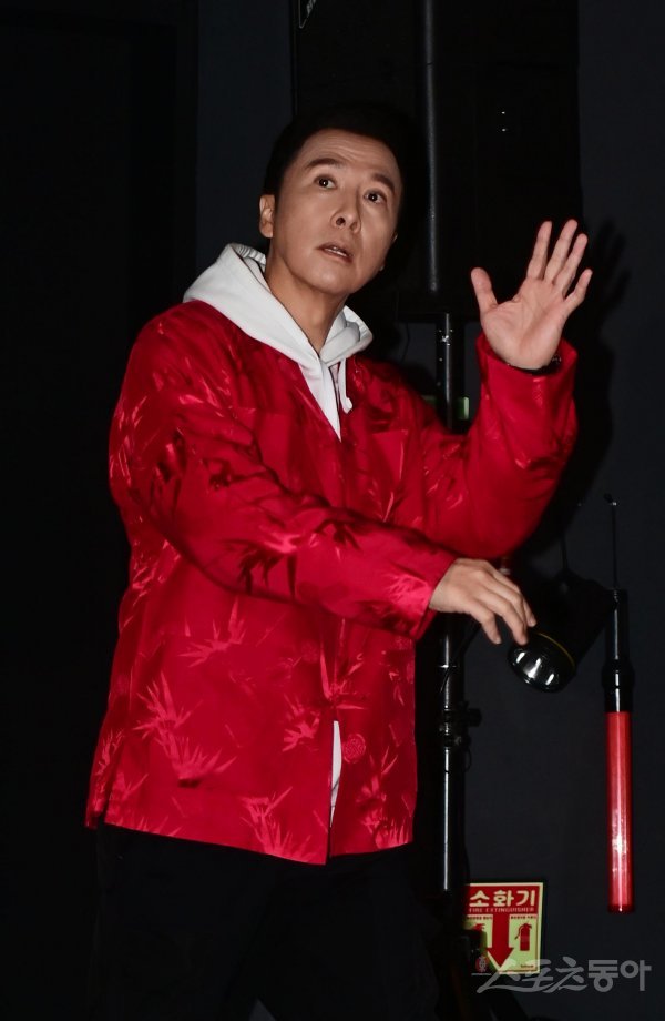 감독 겸 배우 견자단이 19일 서울 광진구 자양동 롯데시네마 건대입구점에서 열린 영화 ‘천룡팔부: 교봉전’ 언론시사회 및 내한 기자간담회 무대에 오르고 있다.
