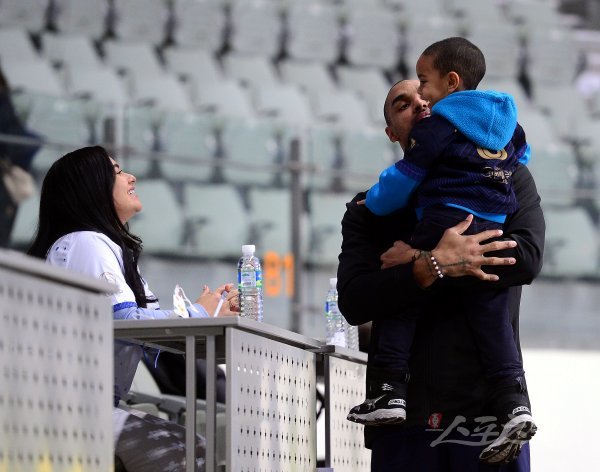 19일 서울 중구 장충체육관에서 ‘2022-2023 도드람 V리그’ 서울 우리카드와 천안 현대캐피탈의 남자부 경기가 열린다. 경기 전 우리카드 아가메즈가 가족과 함께 즐거운 시간을 보내고 있다.