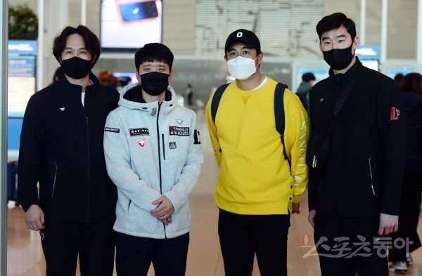 프로야구 SSG 랜더스의 스프링캠프 선발대가 25일 인천국제공항을 통해 미국 플로리다로 출국했다. 최정, 김성현, 김강민, 오태곤이 출국에 앞서 기념촬영을 하고 있다.